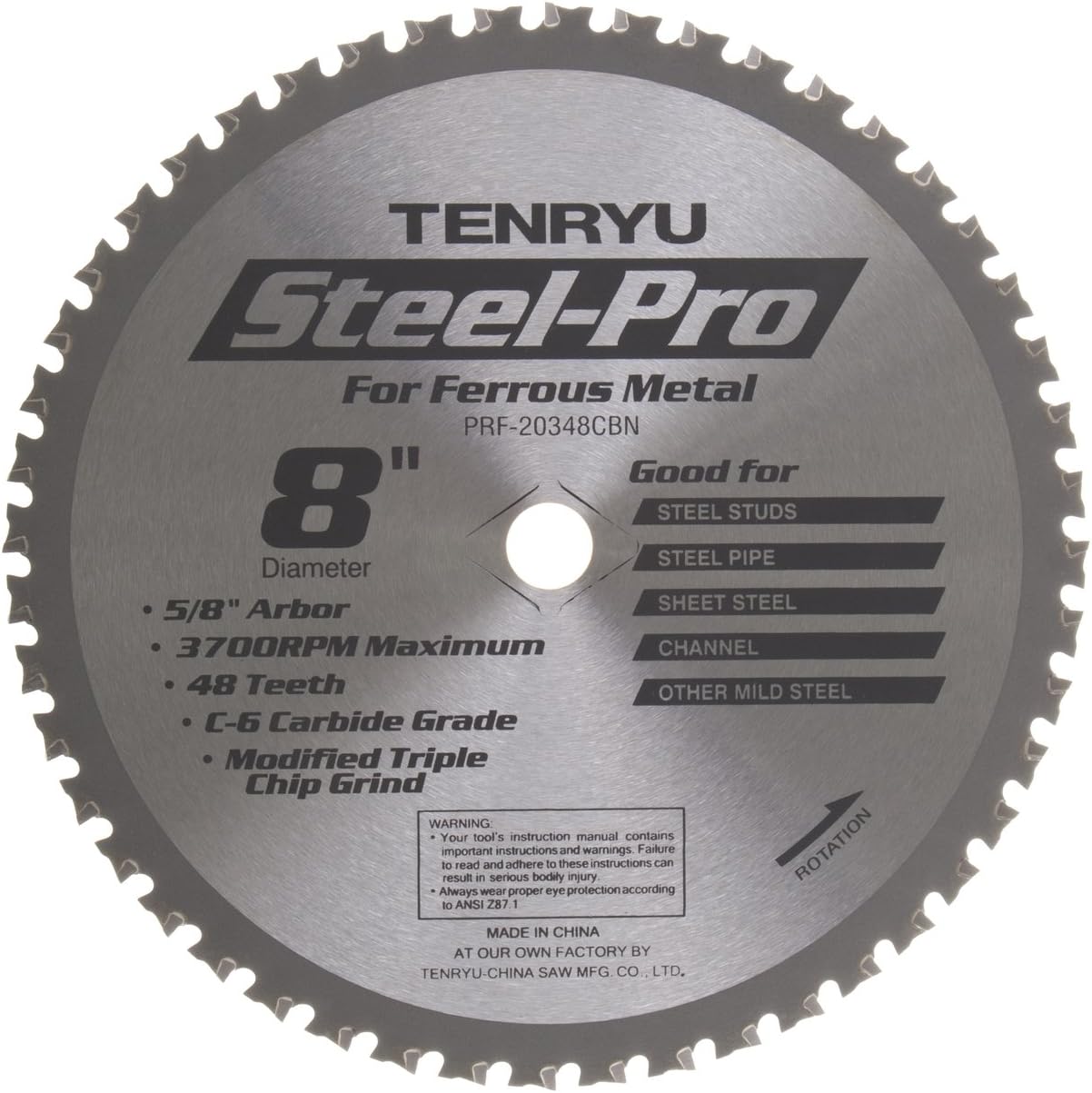 INCLUDES: (1) Steel-Pro Steel Cutting BladeFEATURES: Rugged plates and specially formulated carbide tips with a special tooth grind for fast, clean cuts High quality cuts without the clouds of dust and scorch marks associated with friction blades Cool cuts that leave the work piece edge free of burrs Reduced cost-per-cut and maximized performance for the operator as a result of fewer blade changes Applications: For ferrous metal cutting. General Application.SPECIFICATIONS: Diameter: 8" Teeth: 48 Arbor: 5/8" Grind: ATB Kerf: .087" Rake: 0